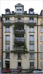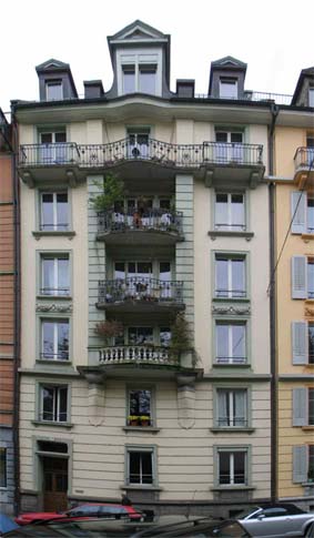 Die Wohnung in der 1. Etage hat auf der Hofseite (Westen) einen Balkon, die Wohnungen in der 2. bis 5. Etage haben neben dem Balkon auf der Hofseite auch noch auf der Ostseite (Strasse) einen Balkon.